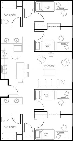 This sample four-person apartment layout shows one configuration of the four-bedroom/two bathroom apartment with kitchen and living room.