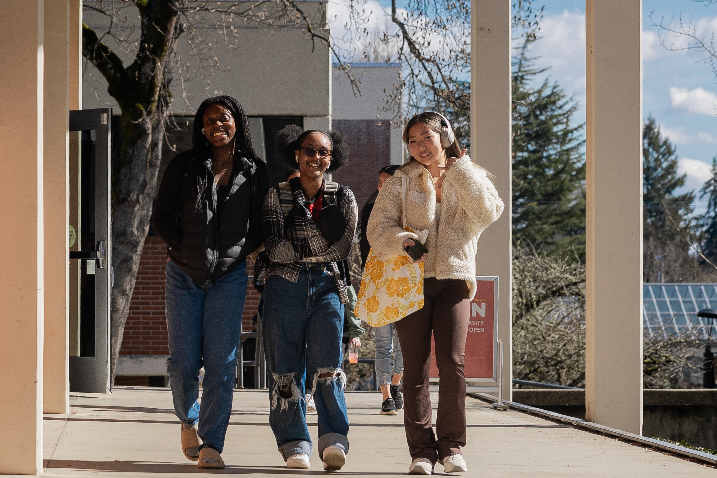 Three students walk through Pacific's Forest Grove campus.