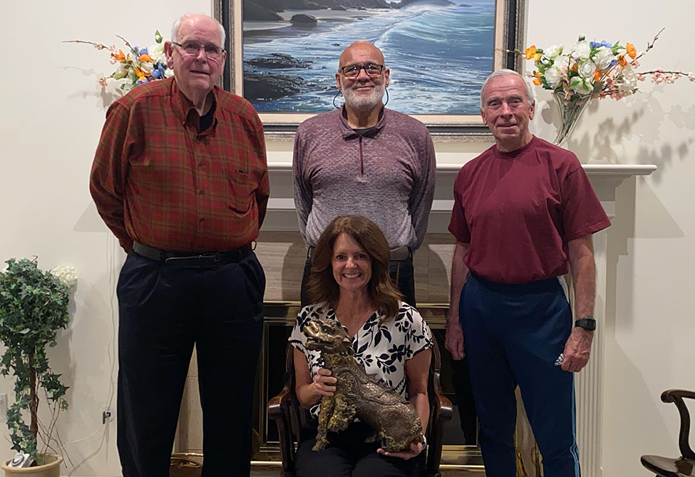 President Jenny Coyle ’90, OD ’93, MS ’00 with three alumni instrumental in the original Boxer's return to Pacific. Standing from left: Bruce Bishop '68, Gary Reynolds '72 and John Howard '72.